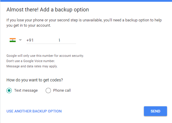 स्टेप 4 अब अपना मोबाइल नंबर डालें How do you want to get codes? आप कोड कैसे प्राप्त करना चाहते हैं? इसके लिये Text message को सेलेक्ट करोगे तो टैक्स मैसेज के द्वारा आपके मोबाइल पर OTP कोड आएगा और अगर आप phone call को सेलेक्ट करोगे तो आपके मोबाइल पर एक कॉल आएगा कॉल के द्वारा आपको OTP code. बताया जाएगा, मेरे हिसाब से आप Text message को सेलेक्ट करें फिर Send पर क्लिक करें।